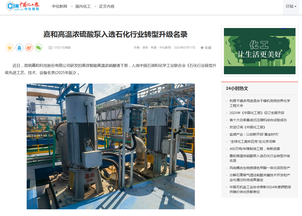 嘉和高溫濃硫酸泵入選石化行業(yè)轉(zhuǎn)型升級名錄