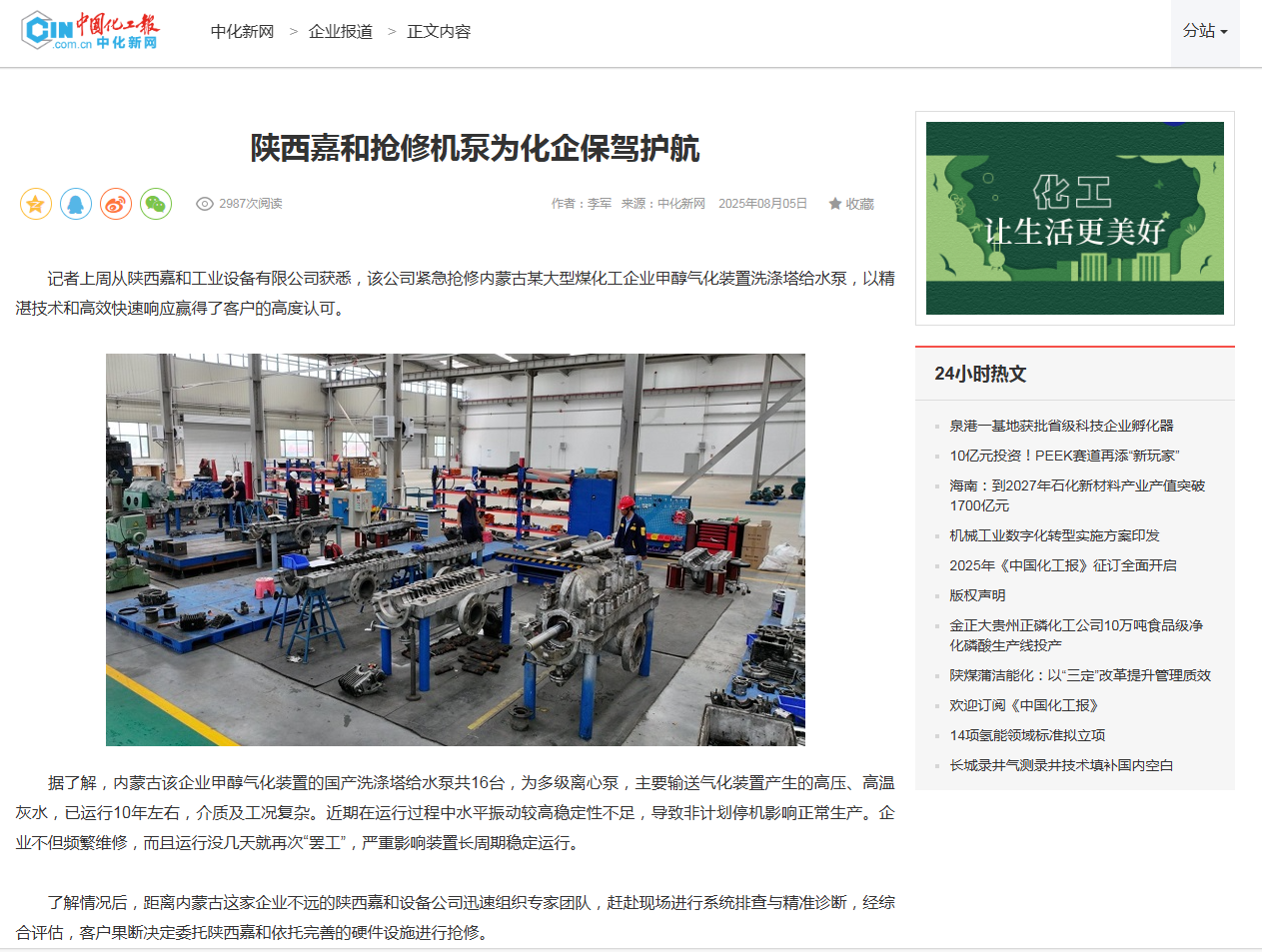 記者上周從陜西嘉和工業(yè)設(shè)備有限公司獲悉,該公司緊急搶修內(nèi)蒙古某大型煤化工企業(yè)甲醇氣化裝置洗滌塔給水泵,以精湛技術(shù)和高效快速響應(yīng)贏得了客戶的高度認(rèn)可。