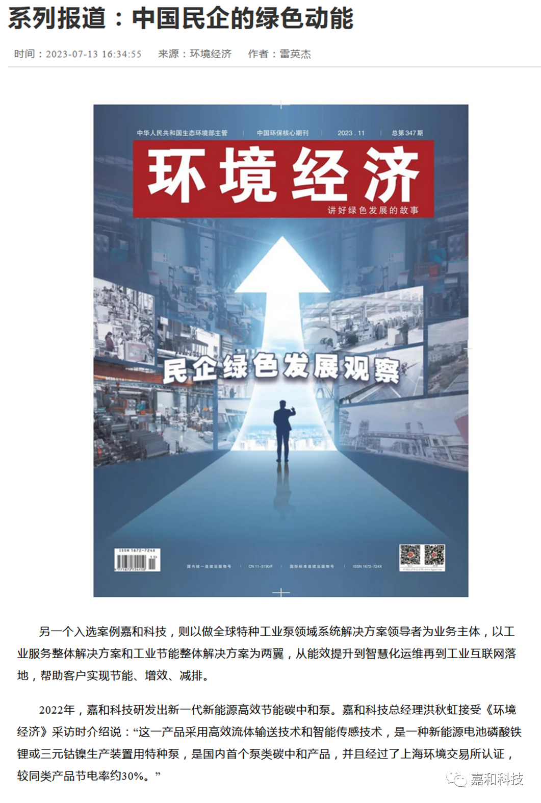 當前,隨著“雙碳”目標的推進,民營企業綠色發展理念不斷提升,綠色發展成效顯現。2022年底,全國工商聯發行《中國民營企業綠色發展報告(2022)》(以下簡稱《報告》),相繼被中國政府網、人民日報、新華社、光明網、經濟參考網、新浪網等主流媒體進行了發布,《報告》梳理總結了2021年度中國民營企業在生產經營、污染減排、節能降碳、綠色轉型升級等領域的實踐成果和典型案例,收錄了17個民營企業綠色發展案例,展現了不同行業民營企業綠色發展的成效和經驗,嘉和科技作為裝備制造優秀案例被收錄在報告中,同時嘉和案例也是國內權威環境經濟期刊《環境經濟》唯一轉載報道的三個典型案例之一!